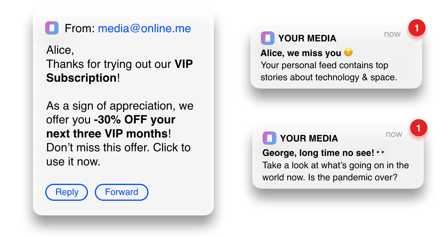 Channels: Push notifications, emails, in-app messages