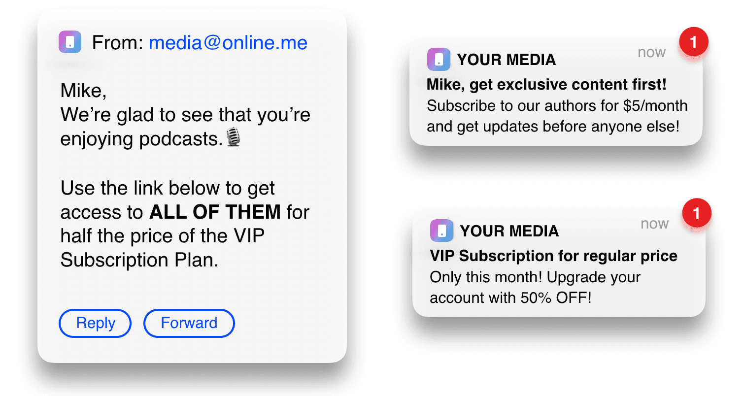 If you want your subscribers to stay active, you need to constantly improve their experience. Relevant and well-timed messaging is an essential part of that. It helps customers stay informed, avoid questions and confusion. You can use emails for transactional messaging, deliver special offers and personalized promotions via push notifications/emails, introduce and showcase new features via in-apps.