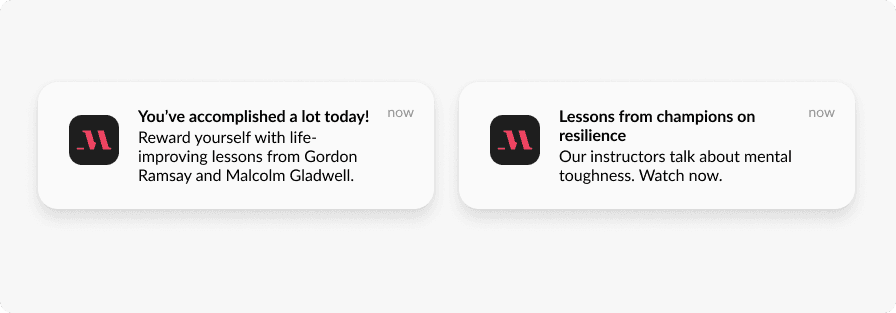 For example, when a user completes an educational video, Masterclass engages them with a push notification that promotes similar content:
