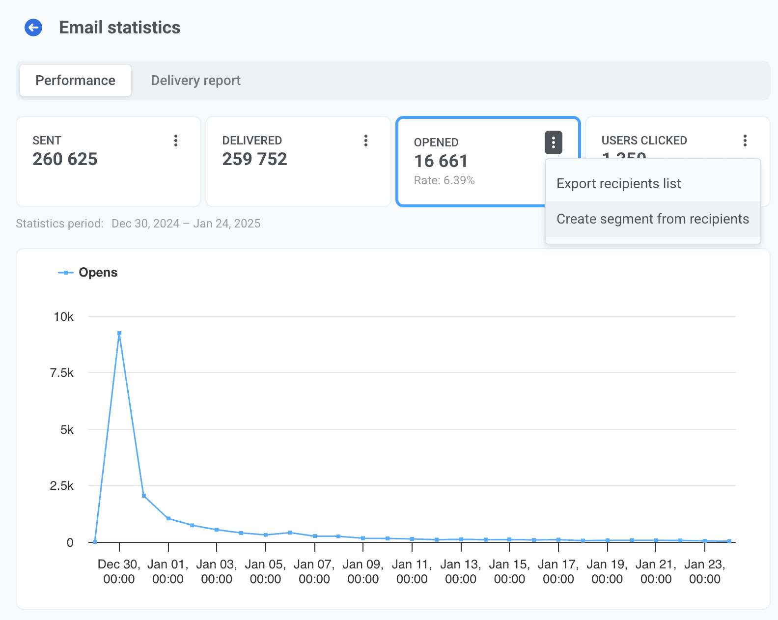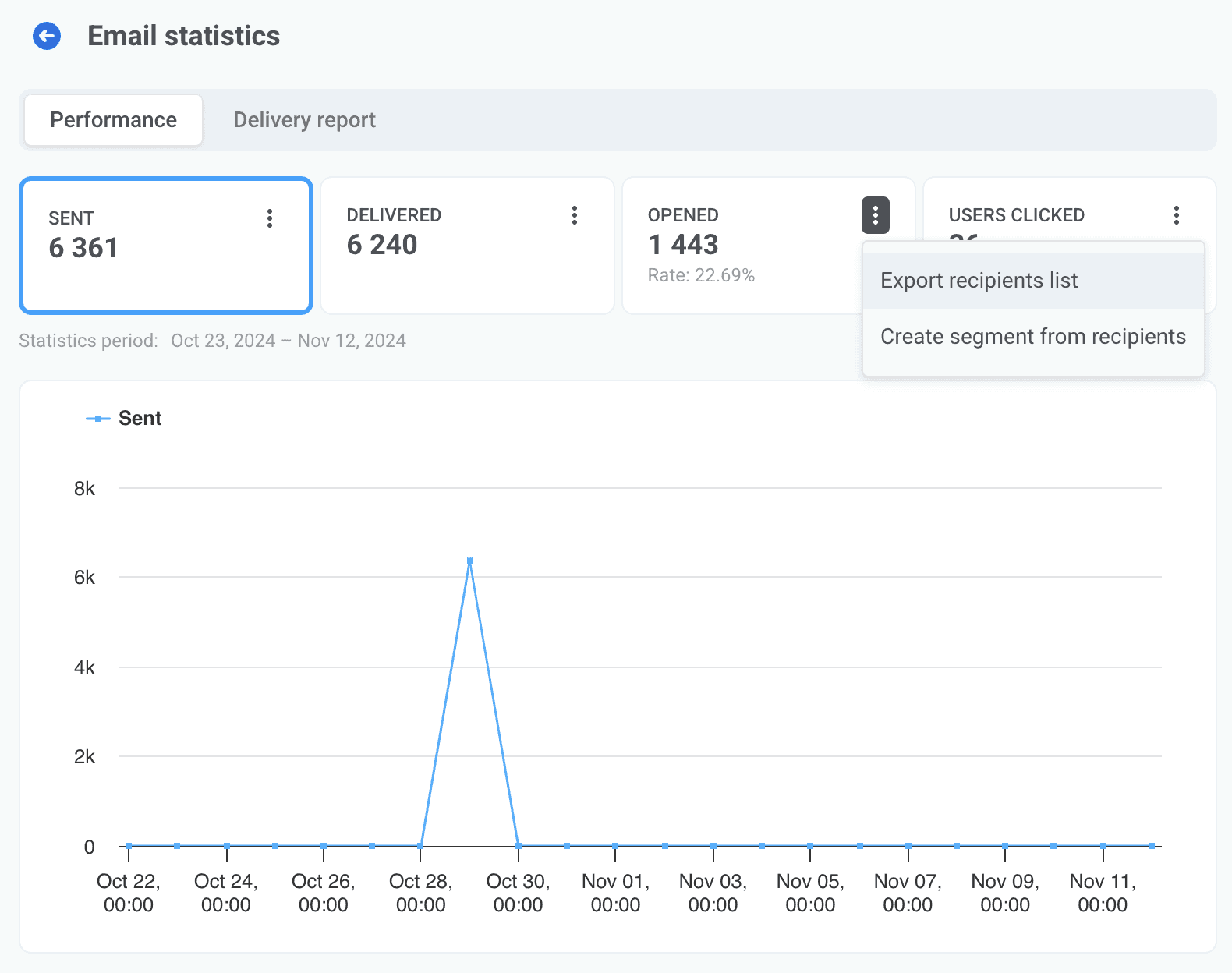 - Sent, delivered, opened, and users clicked with the ability to export user emails and user IDs.