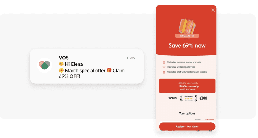 Here is an example of VOS, a well-being app, incentivizing short-term subscribers to make larger purchases: