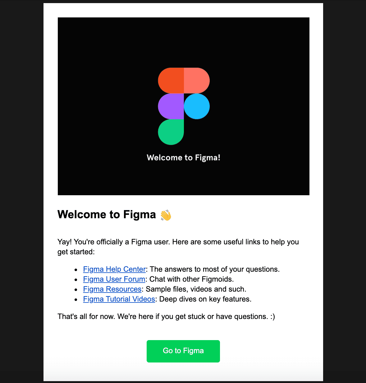 Figma is a popular browser-based UI/UX design tool. Its welcome email greets new users with a logo, expresses excitement about a new user and offers helpful tips on how to start using the application.